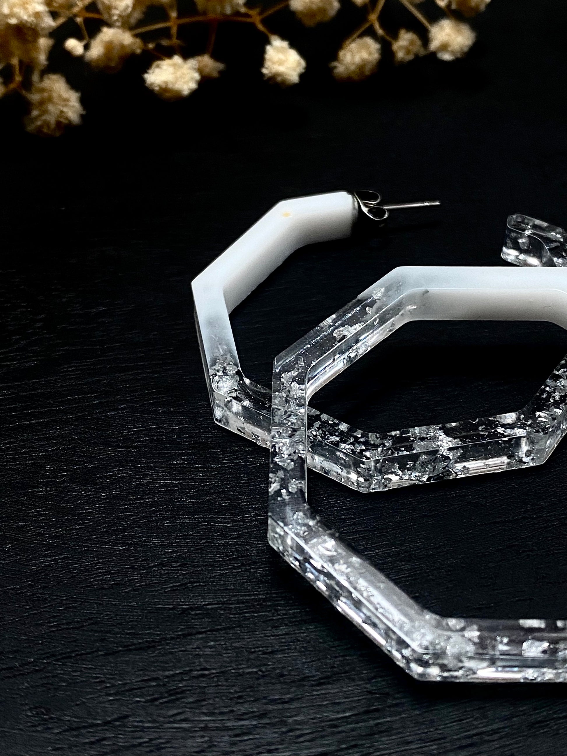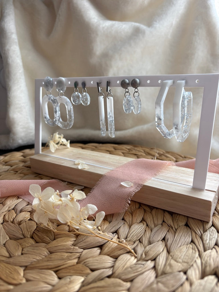 Apportez une touche de douceur et d’élégance à votre style avec cette collection de boucles d’oreilles artisanales en résine époxy. Chaque modèle est réalisé à la main et sublimé par de délicates feuilles argentées incrustées, qui reflètent la lumière avec subtilité.